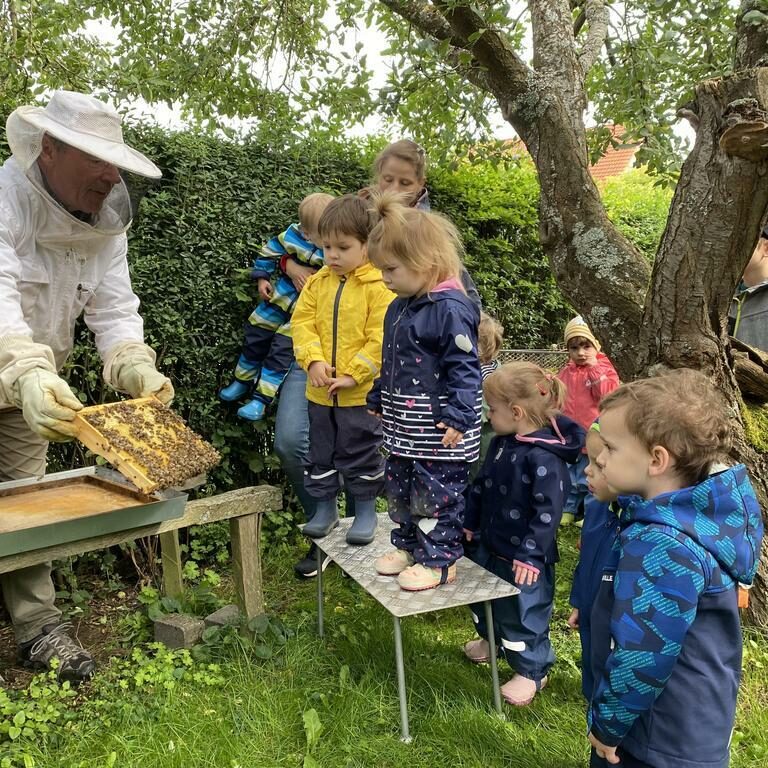 Vor den Sommerferien durften unsere ein- und zweijährigen Kindergartenkinder das Imkerpaar Hedwig und Franz-Josef Brengmann in Hambuch besuchen.