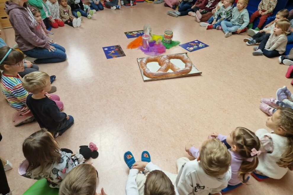 Die Kinder des Kindergartens Rasselbande in Hambuch freuten sich an ihrer St. Martinsfeier über eine Riesenbrezel, die die Ortsgemeinde Hambuch ihrem Kindergarten spendete.