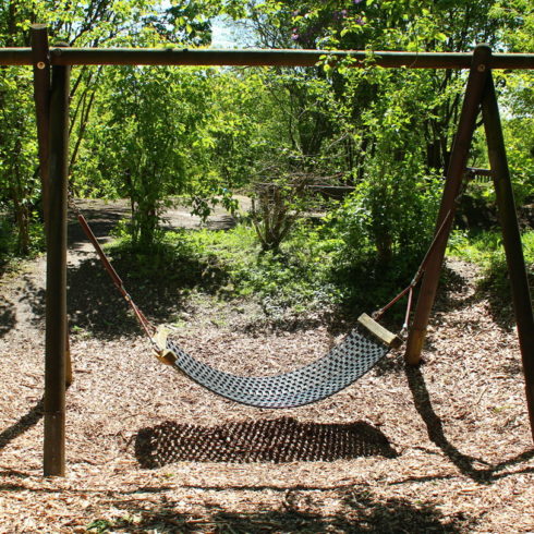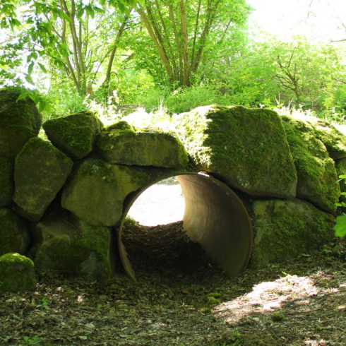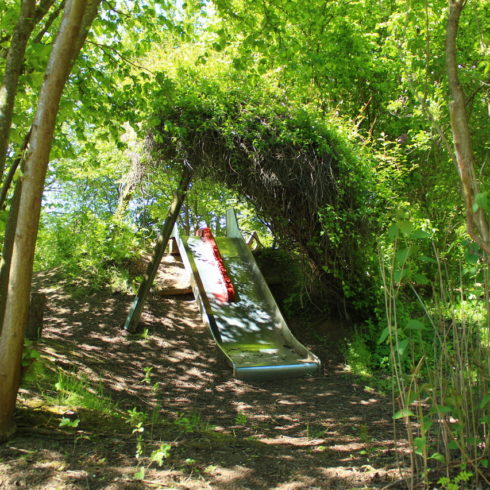 Wir planten eine Landschaft die Spielhügel, Bachläufe, Beobachtungspunkte, natürliche Versteckmöglichkeiten und Kommunikationsnischen mit Licht und Schattenbereichen aufwies. Voraussetzung war weiterhin, dass wir von den herkömmlichen Spielgeräten Abstand nehmen und überwiegend natürliche Materialien verwenden wollten.